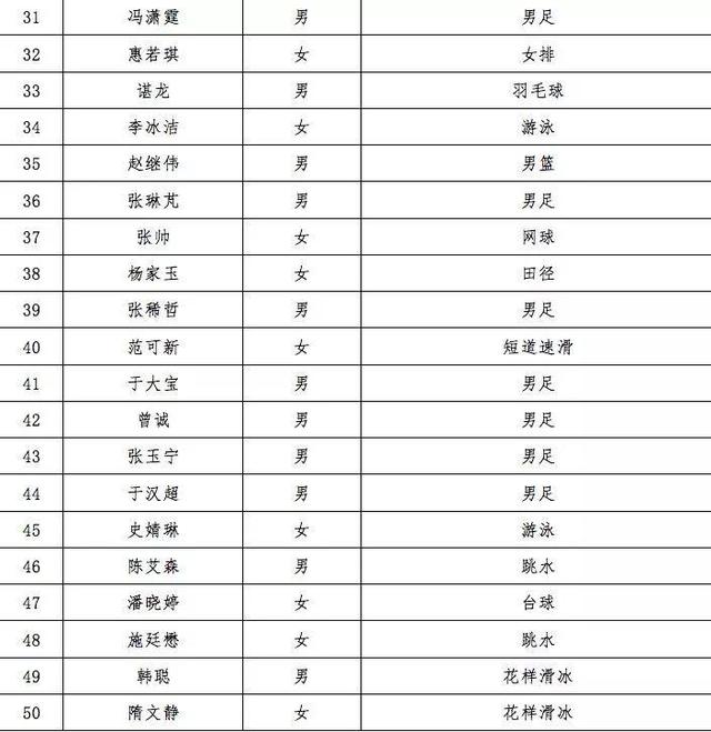 张 继科虽然在去年竞技力直线下滑,但是依然排名第2。柯洁作为围棋“网红”代表排名第3。中国男篮最红的球员是丁彦雨航,他超过了曝光度明显下滑的宁泽涛。 当今乒坛霸主马龙则排名第6,丁宁是女性中传播影响力最大的,位居所有运动员第7位。之后则是国足队长郑智,以及在赛场上强势无比的中国女排队长朱婷,中 国田径飞人谢震业在第10位。