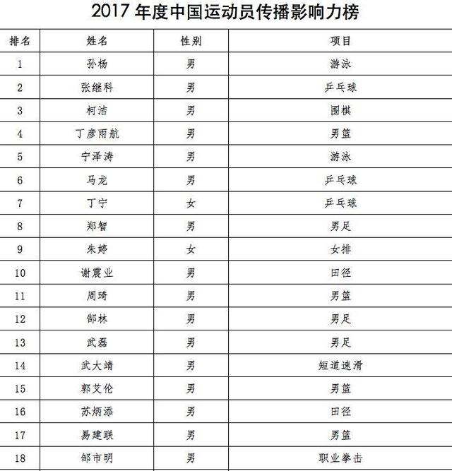 由中国体育报业总社发起并主办,新体育网具体执行的中国体育价值榜系列榜单发布,需要注意的是,在“2017年度中国运动员传播影响力榜”中,孙杨当之无愧排名第一,张继科与柯洁紧随其后。