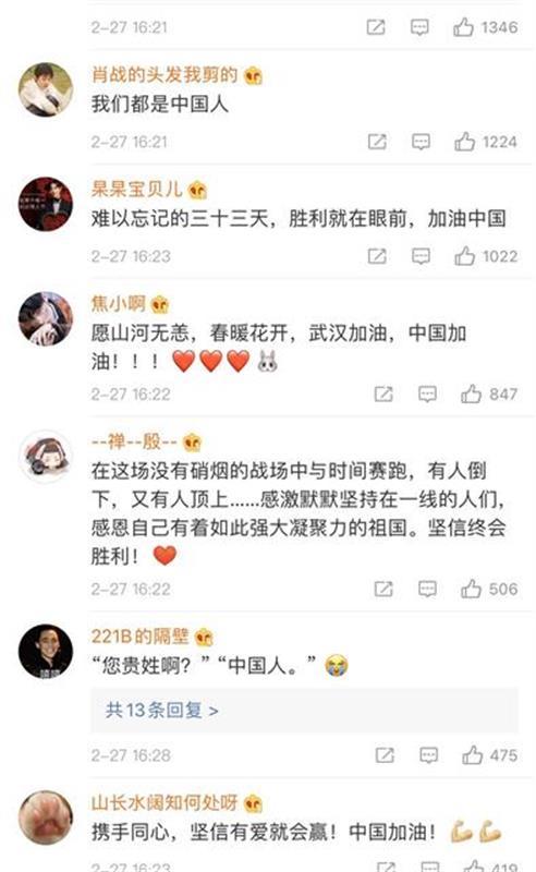 视频短片一上线,就引起了大家的广泛关注,全国网友为武汉发声祝福。“短片《三十三》看完泪目,2020年注定是最难忘最深刻的一年,但也坚信一定会好起来,我们一起期待春暖花开,为武汉加油!”“小爱汇聚成大爱,彼此保护从不是说说而已。武汉加油,14亿中国人加油!”