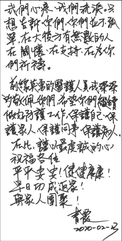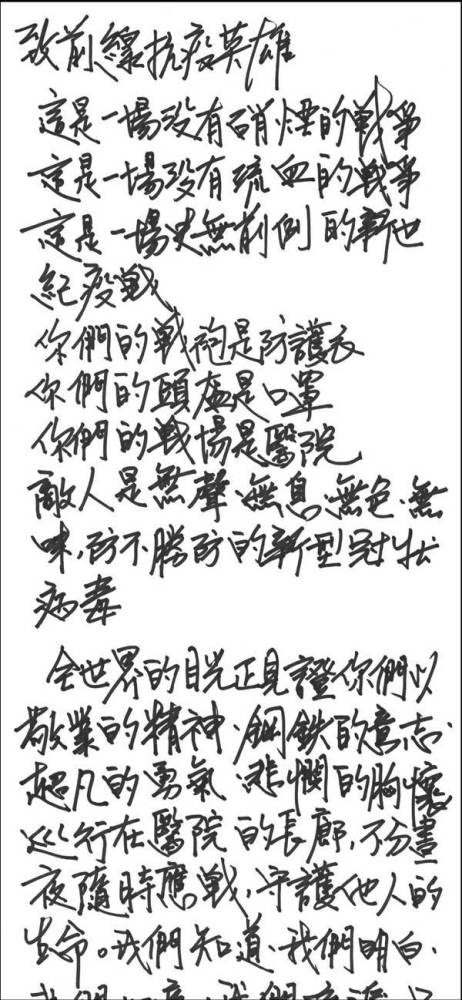 ▲林青霞手书《致前线抗疫英雄》