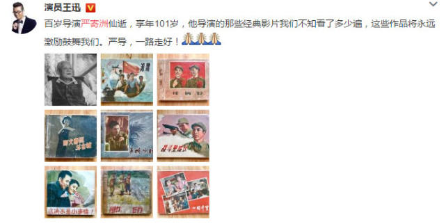 王迅在微博发文悼念严寄洲导演,称“他导演的那些经典影片我们不知看了多少遍,这些作品将永远激励鼓舞我们”。