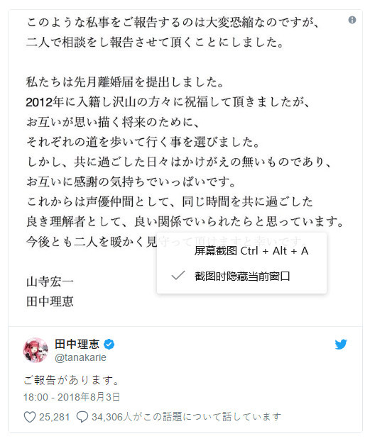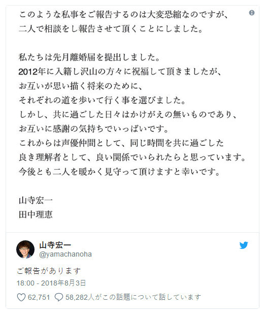 山寺宏一与田中理惠于2012年6月17日宣布结婚,昨天下午同时在其官方推特上发表了同一份离婚公告,宣布结束两人6年的婚姻。公告中写道:“我们在上个月提交了离婚申请书。虽然在2012年我们结婚时获得各方的祝福,但是为了今后我们彼此的将来考虑,我们选择走上不同的道路。但是,我们共同度过的日子是无可替代的,我们对彼此都充满了感谢的心情。日后我们将作为声优同事,共同度过一样的时间,作为最好的理解者维持良好的关系。今后大家也能温暖地守护我们两人的话,我们会很幸福。”