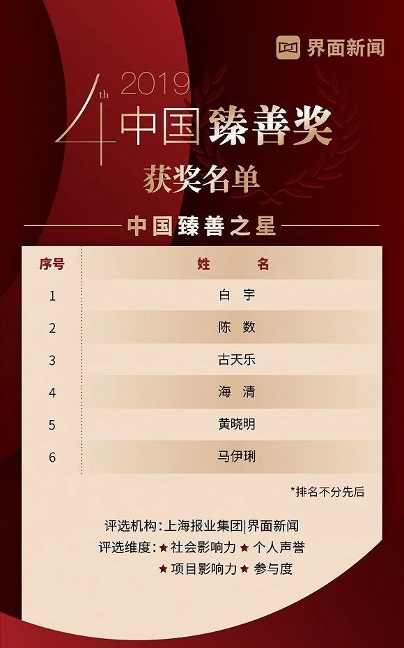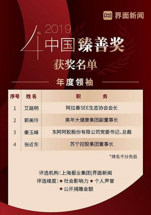 由上海报业集团 | 界面新闻发起的2019【中国臻善奖】终榜于12月26日在京正式揭晓。艾路明、郭美玲、秦玉峰、张近东4位商业领袖上榜,阿里巴巴、分众传媒、光明乳业、恒大集团、美年大健康等30家知名企业获得年度臻善企业奖项。