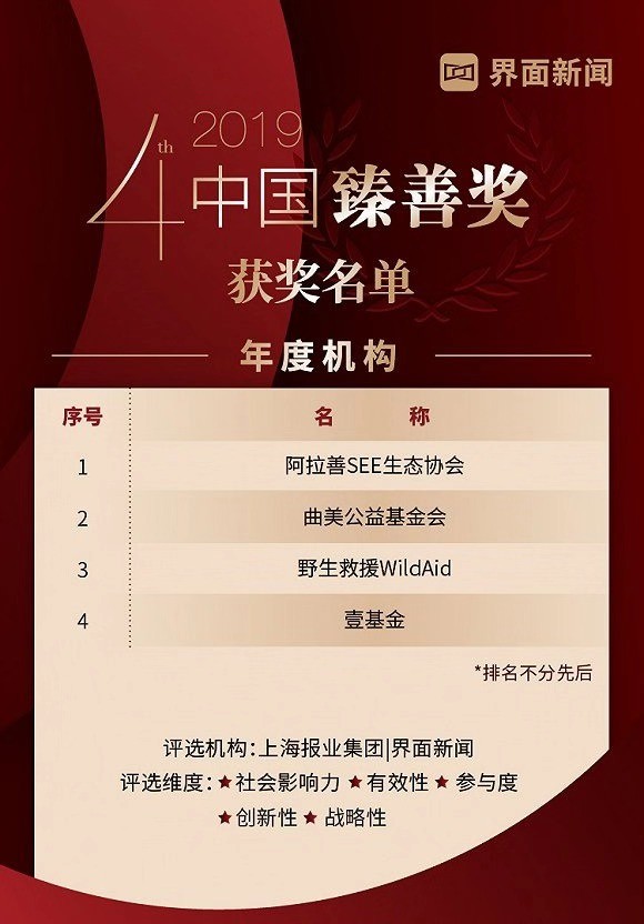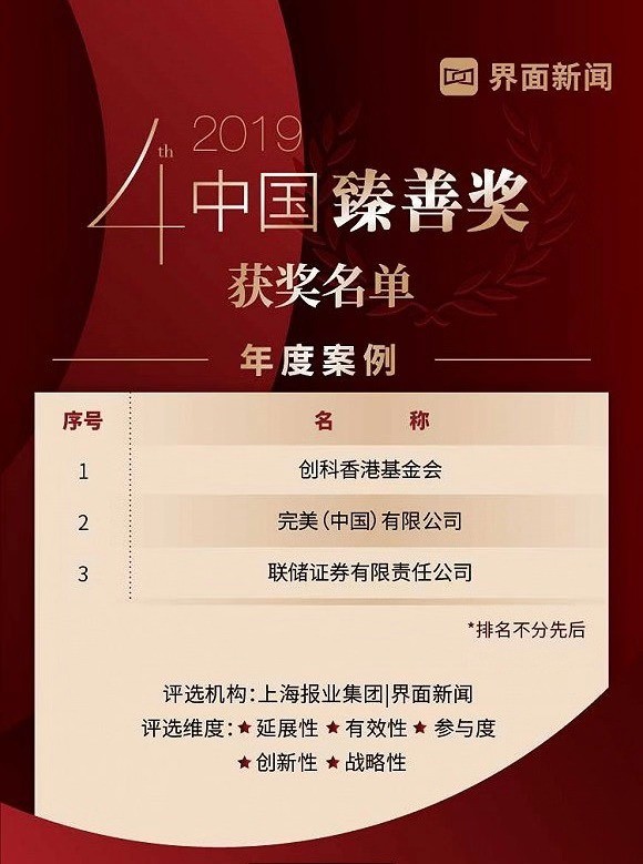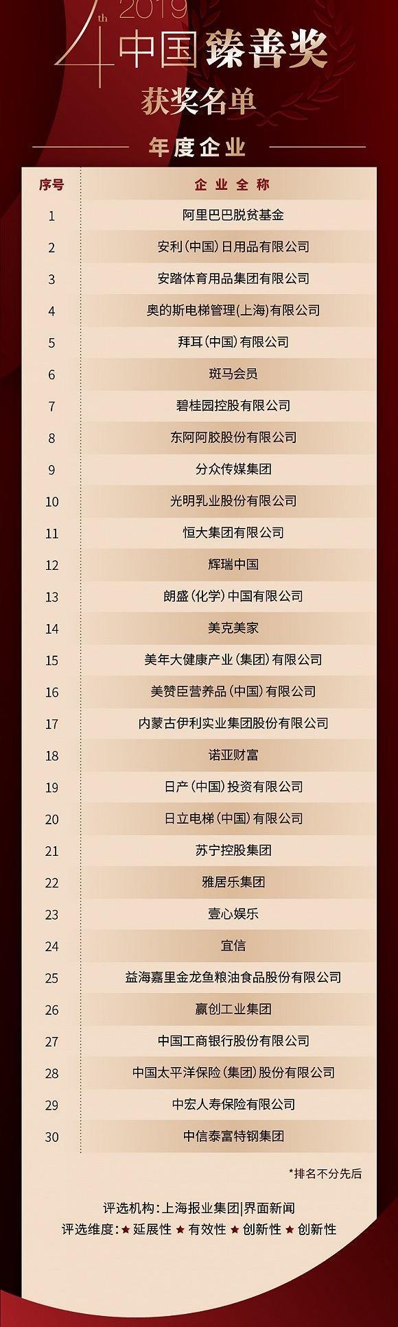 2019年12月26日,由上海报业集团 | 界面新闻发起的2019【中国臻善奖】颁奖典礼在北京瑰丽酒店顺利落下帷幕。在为期数月的评选过程中,经过公开征集案例提报、网络投票等环节层层选拔后,共有逾200家企业机构、近百位商业领袖进入到最终的专家评审环节。最终,共有30家企业凭借自觉的企业责任意识和创新发展理念荣获“中国臻善奖-年度企业”大奖,4位企业领袖获评“中国臻善奖——年度臻善领袖”,3位荣膺“中国臻善奖——年度责任官”大奖,4家公益机构荣获“中国臻善奖-年度机构奖”,3则优秀案例获评“中国臻善-年度案例”,6位明星荣获“中国臻善奖——臻善之星“称号。