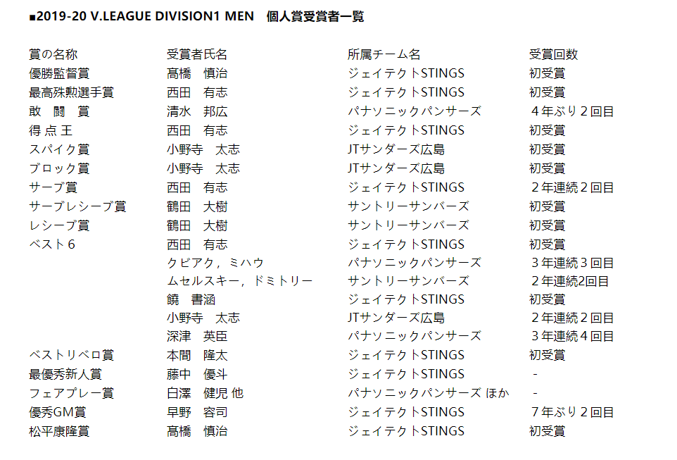 2月29日周六,受疫情扩散的影响,本赛季日本男排联赛的总决赛在封闭的无观众场馆内进行。新贵捷泰格特蜂刺向卫冕冠军松下黑豹发起了冲击,最终双方大战五局,捷泰格特以(17-25,25-22,25-22,26-28,15-10)笑到了最后,夺得了建队历史上的首个联赛桂冠。此役捷泰格特的头号球星西田有志继续着强势的发挥,将本届联赛的MVP收入囊中。