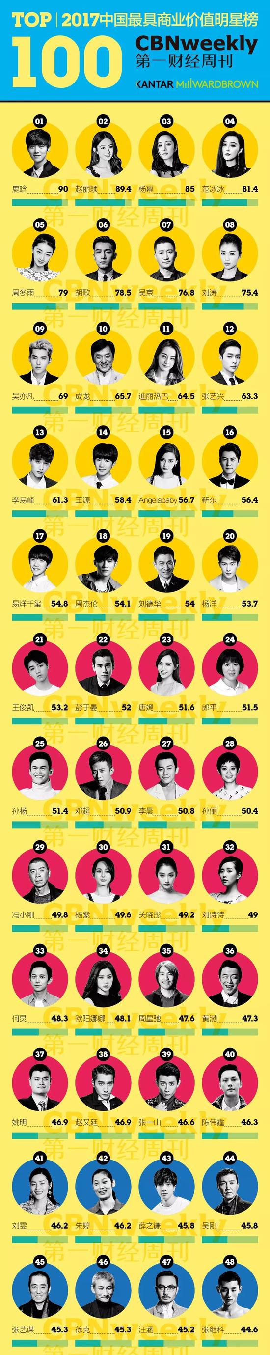 在《第一财经周刊》的“2017中国最具商业价值明星榜”上,鹿晗凭借超强的社交媒体活跃度与代言能力占据榜首,位居第二、同时也是女星第一名的则是作品数量与代言皆表现突出的赵丽颖——去年两人分列本榜单的第七与第八。