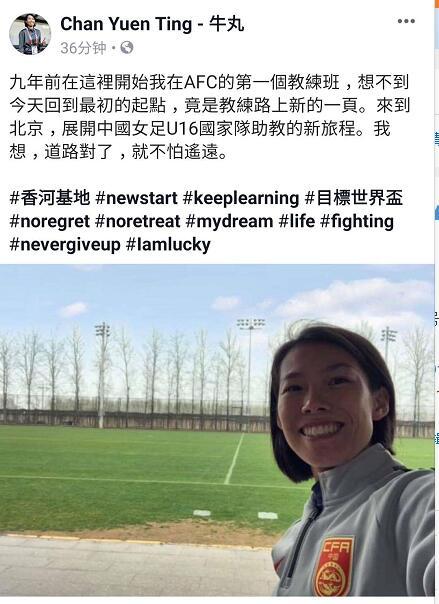 同时陈婉婷也定位在香河基地并发布了一段文字:九年前在这里开始我在AFC的第一个教练班,想不到今天回到最初的起点,竟是教练路上新的一页。来到北京,展开中国女足U16国家队助教的新旅程。我想,道路对了,就不怕遥远。