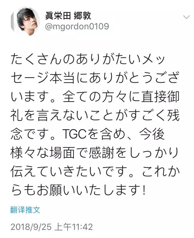 之后也有再次更新推特:“收到了很多令人感激的留言,真的非常感谢。很遗憾不能直接向所有人道谢。包括TGC在内,今后在各种各样的场合中都想好好地传达感谢。今后也请多多关照!”