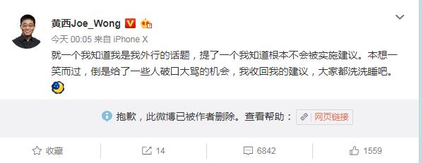 今日凌晨,面对舆论压力,黄西删除了微博并回应称:“就一个我知道我是我外行的话题,提了一个我知道根本不会被实施建议。本想一笑而过,倒是给了一些人破口大骂的机会,我收回我的建议,大家都洗洗睡吧。”