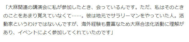 然而缓刑中,她还是在推特上一直推行自己的大麻合法论。身体曾抱恙的安倍被她发过推特安利其使用大麻来治疗,就连近期她也一直在推特说应该将大麻用于医疗,比如欧美的幻觉剂治疗。。。 底下有网友也顺从她的想法呼吁,请将大麻合法化。