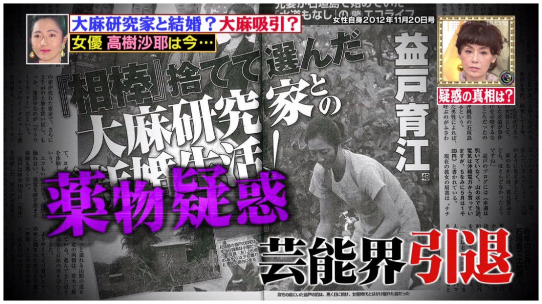 观众这个时候可能也只是把这个节目里的几人当奇葩来看,但仅两周以后,新闻就报道了高树沙耶因石垣岛的家里藏有55克大麻被逮捕的消息。