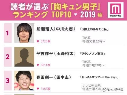 年底,各大榜单相继出炉,其中在“2019年秋季剧心动男子”和“2019秋季日剧·最佳情侣档排行榜”两个大热人气榜单中,榜首都被中川大志所占据。