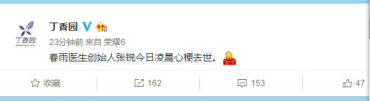 丁香园官方微博6日消息,春雨医生创始人张锐今日凌晨心梗去世。