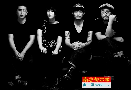 ????窦佳嫄在微博宣传单曲:“第一次发声,有点激动,希望大家喜欢。”她和Tim?ers乐队成员周骏(左一,丢火车乐队贝斯)、孙凌生(右二, 果味V?C原主唱)、夏侯哲(右一,音乐制作人)一起。