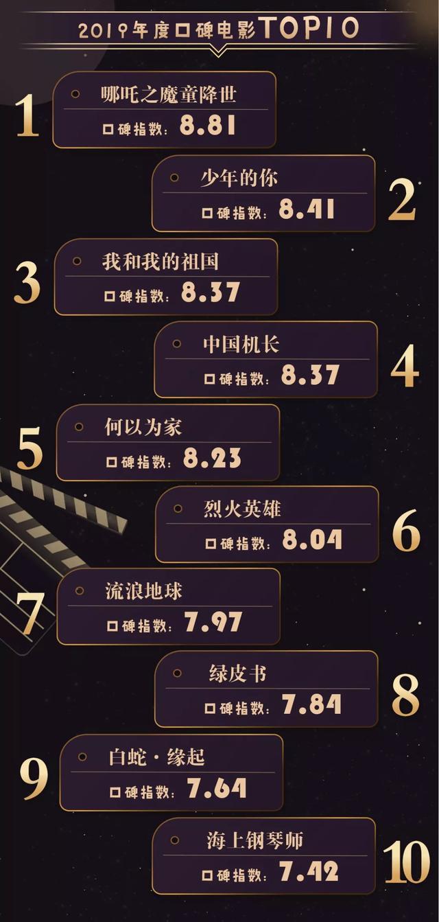2019年度"金碑奖"口碑电影TOP10包括:哪吒之魔童降世、少年的你、我和我的祖国、中国机长、何以为家、烈火英雄、流浪地球、绿皮书、白蛇·缘起、海上钢琴师。