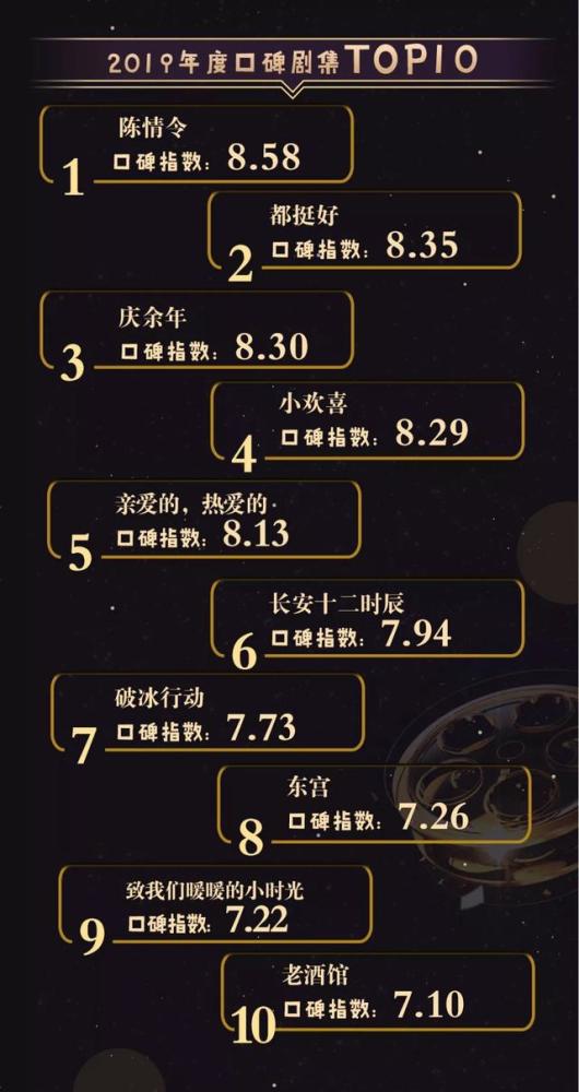 2019年度“金碑奖”口碑剧集TOP10包括:陈情令、都挺好、庆余年、小欢喜、亲爱的,热爱的、长安十二时辰、破冰行动、东宫、致我们暖暖的小时光、老酒馆。