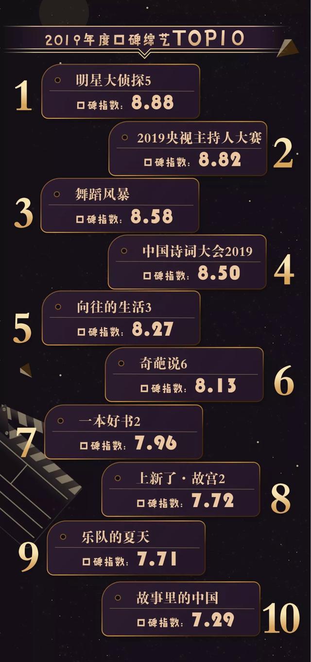 2019年度“金碑奖”口碑综艺TOP10包括:明星大侦探5、2019央视主持人大赛、舞蹈风暴、中国诗词大会2019、向往的生活3、奇葩说6、一本好书2、上新了·故宫2、乐队的夏天、故事里的中国。