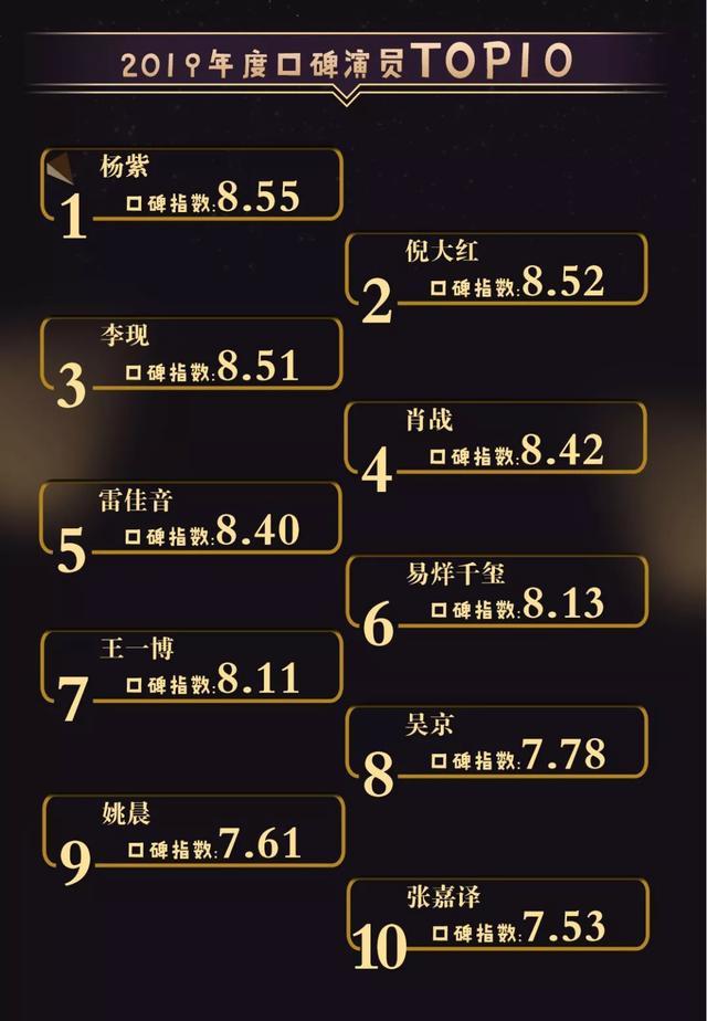 2019年度“金碑奖”口碑演员TOP10包括:杨紫、倪大红、李现、肖战、雷佳音、易烊千玺、王一博、吴京、姚晨、张嘉译。