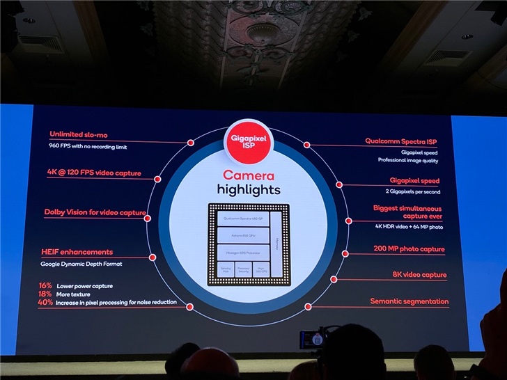 骁龙 865 的 ISP? 处理速度高达惊人的每秒 20 亿像素,并支持全新的拍摄特性与功能。用户可以拍摄拥有 10 亿色的 4K HDR 视频,也可以拍摄 8K 视频,亦或捕捉高达 2 亿像素的照片。通过 960 fps 不限时高清慢动作视频拍摄,用户还可以充分利用十亿像素级处理速度来拍摄慢动作视频,捕捉每一毫秒的细节。