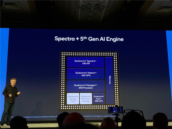 凭借骁龙 X55 5G 调制解调器及射频系统,骁龙 865 可以提供高达 7.5 Gbps 的峰值速率,同时搭载第五代高通人工智能引擎 AI Engine和全新高通传感器中枢(Sensing Hub),旨在带来比以往平台更智能、更个性化的体验。得益于 Qualcomm Spectra 480 ISP 支持的极速十亿像素级处理能力——高达每秒 2 0亿像素处理速度,骁龙 865 为移动终端的照片和视频拍摄提供了全新特性。此外,全新 Qualcomm Snapdragon Elite Gaming 支持一系列面向端游级别体验和极致逼真图形性能而设计的新特性,新一代 Kryo 585 CPU 的性能提升高达 25%,全新 Qualcomm Adreno 650 GPU 的整体性能较前代平台提升 25%。