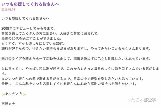 Kana在宣言中表示:“想无期限地去挑战各种各样的事物。”主要目的是为了充电,能够充实度过私人时间。