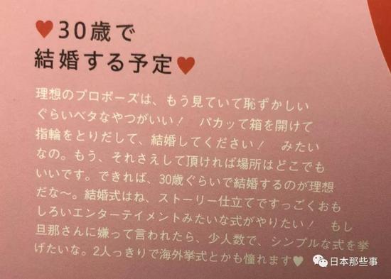 访谈部分译文:“理想的求婚方式,那种让人看着都觉得羞耻的土味求婚(我觉得)就很棒!”啪地一下打开首饰盒,拿出戒指,说‘请跟我结婚吧!’那种。只要有这个环节,在什么地方求婚都没关系。如果可以的话,30岁左右结婚是比较理想的。”