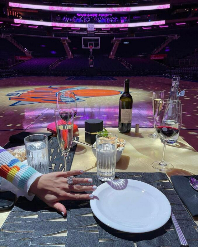 罗斯在社交媒体上晒出女友Alaina戴上戒指的照片,他写道: