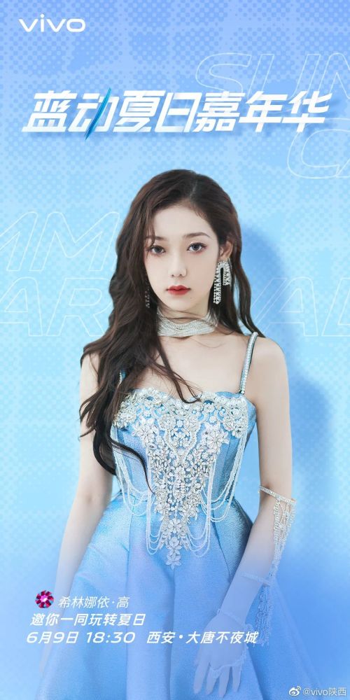06月09日,希林娜依高将空降蓝动夏日嘉年华活动现场——西安大唐不夜城,亲临vivo天猫直播间与粉丝们互动,现场还有精美礼品和签名照相送!