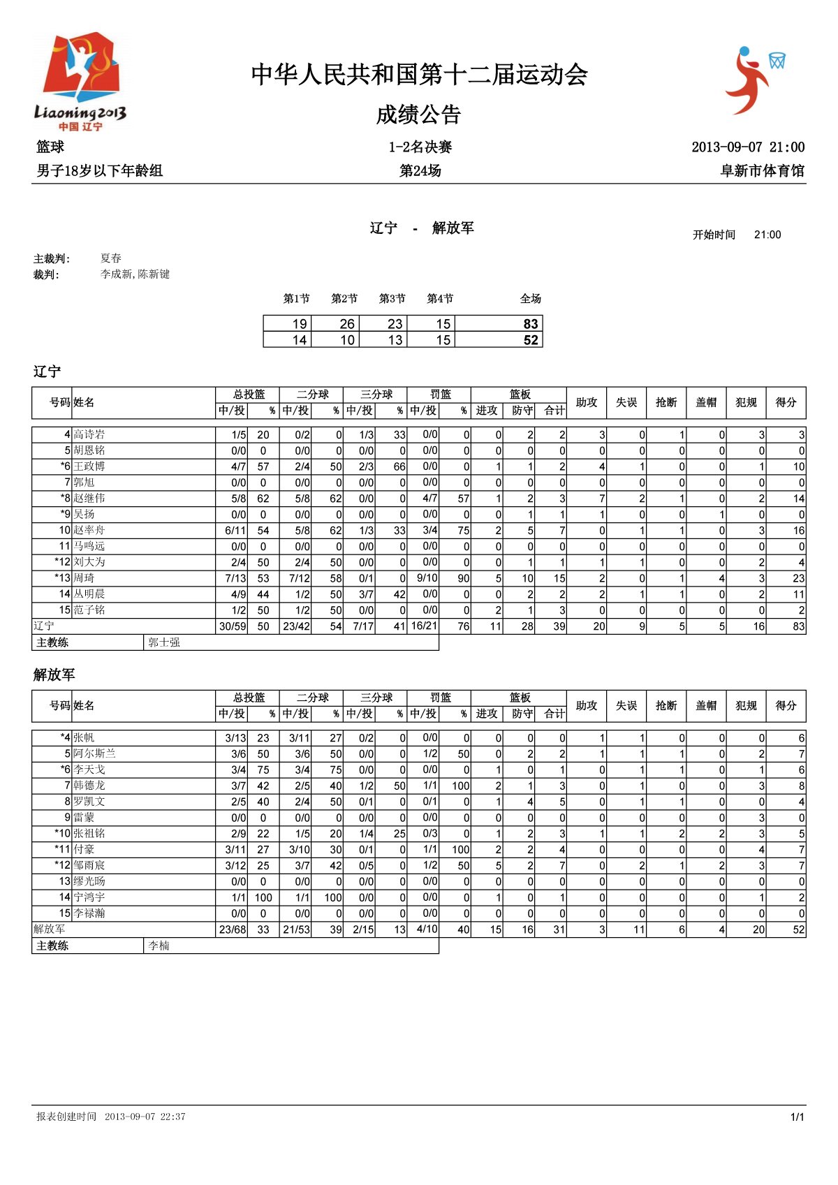 最后一节,周琦前场篮板球,直接单手补扣入筐,74-41。比赛早早失去了悬念,周琦左手勾手打中后,76-43。比赛还2剩分钟的时候,辽宁队换下包括周琦在内的全部主力。最终,实力强大的辽宁青年队以83-52大胜解放军队,六连胜拿到冠军,创造了历史。