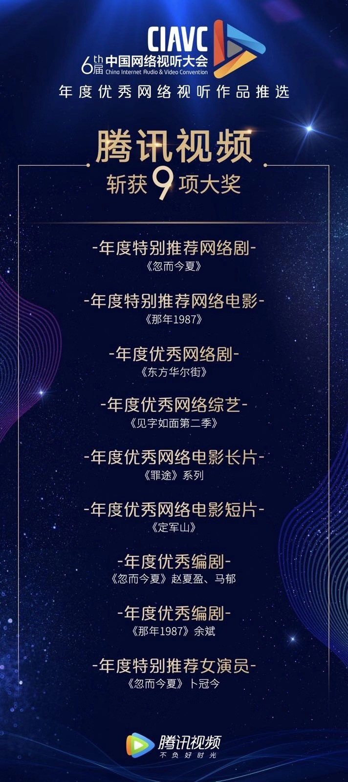 “正能量、高品质、创新性、年轻化”,一直是腾讯视频坚守的内容价值观。在本次评选中,腾讯视频凭借对优质内容的全面布局和精品化制作能力,在电视剧、综艺、电影等领域受到观众和业界权威的肯定。其中在剧集方面,获得“年度特别推荐网络剧”“年度优秀编剧”“年度特别推荐女演员”三项大奖的《忽而今夏》则通过年轻化、写实化的叙事表达,向年轻人传递勇于追逐梦想、不懈努力的正能量。获得“年度优秀网络剧”的《东方华尔街》,凭借创新的剧集模式为行业剧类型树立全新标杆。