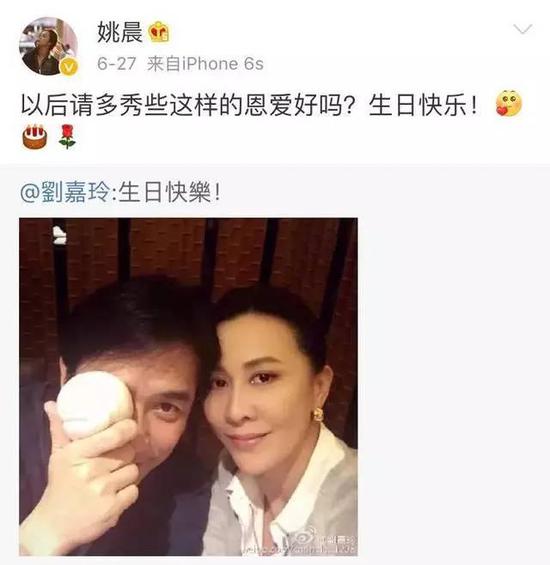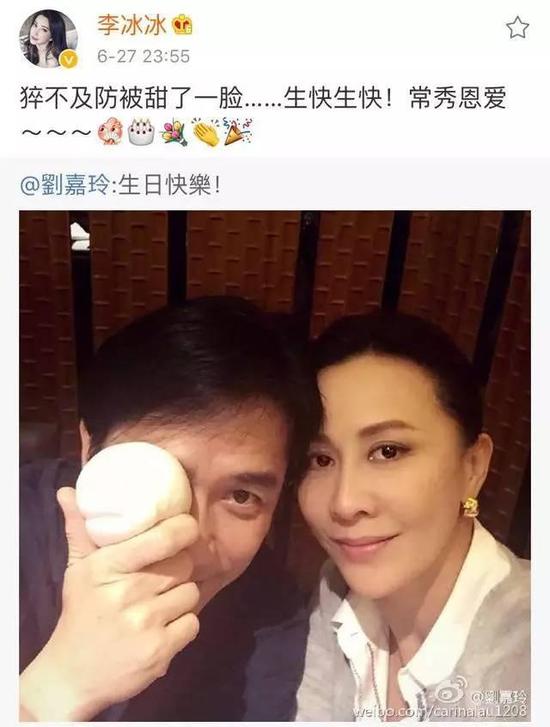 刘嘉玲为梁朝伟庆祝生日,PO出了男神梁朝伟犹抱琵芭半遮面的“寿桃照”,两个人难得的同框~