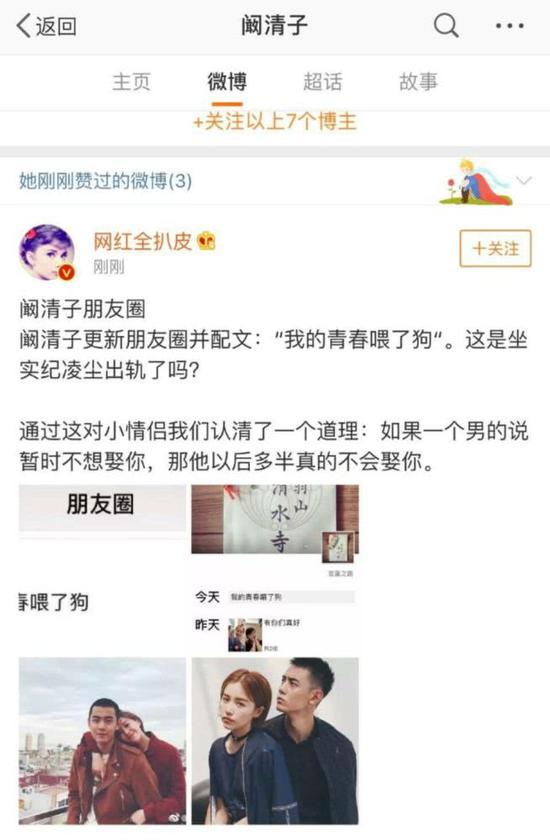 最近,阚清子点赞了一个网友的微博,内容是“如果一个男的说暂时不想娶你,那他以后多半真的不会娶你。”