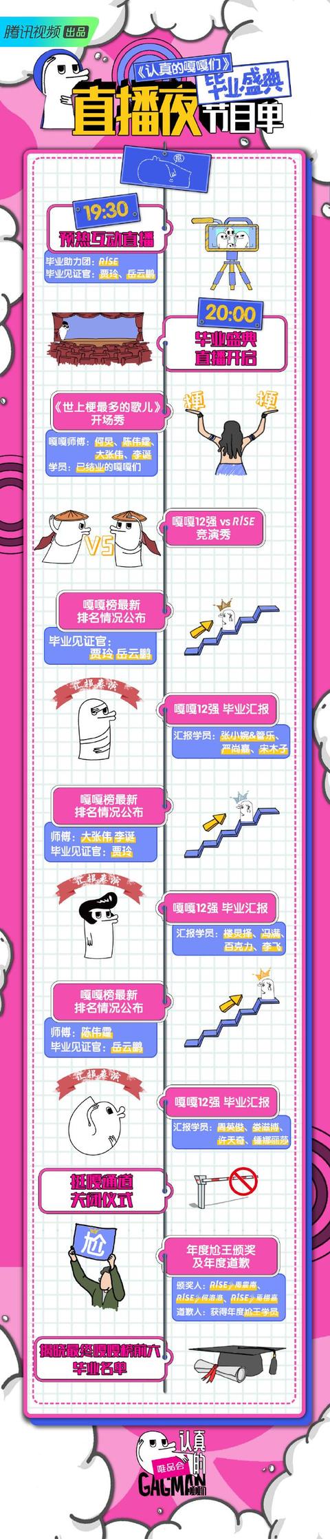 这个夏天,gagman显然已经全面入侵我们的综艺到生活,当我们已经习惯了用"嘎嘎嘎"相互问候的时候,十二位嘎嘎学员在通过层层考验之后,将凭借自己的认真和有趣登上最后的高光时刻——毕业盛典舞台。今晚(9月4日)20点,这档腾讯视频出品,寻找拥有专业综艺技能的"有趣综艺新偶像"选拔类真人秀节目《认真的嘎嘎们GAGMAN》即将在这场毕业盛典直播中,诞生最终的GAG6。毕业之夜,嘎嘎们又将带给观众怎样惊喜的成团现场?毕业见证官贾玲、岳云鹏以及毕业助力团R1SE,面对这群"抢饭碗"的嘎嘎们,又将还以何种颜色?谁又能最终赢得大众芳心,以GAG6的最高荣誉在嘎嘎技校中毕业?