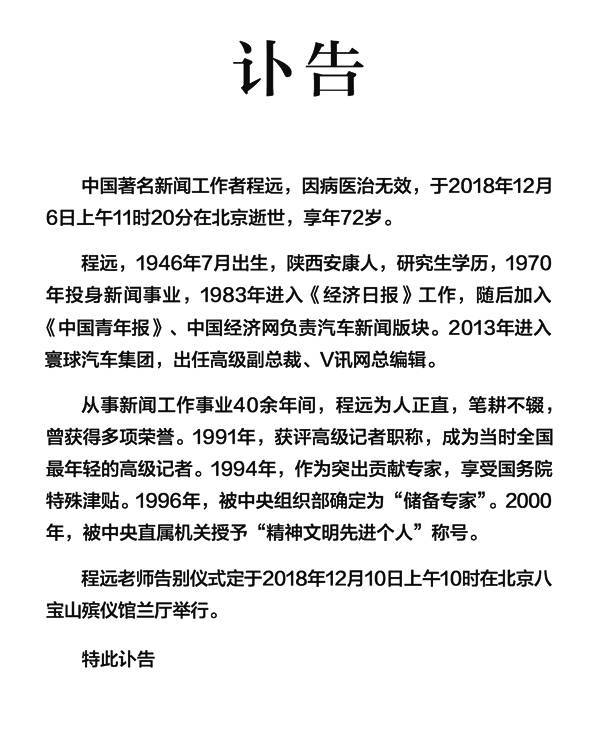 著名汽车媒体人程远,因病医治无效,于2018年12月6日上午11时20分在北京逝世,享年72岁。
