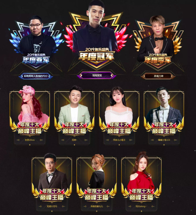 伴随着劲歌热舞,2019十大巅峰主播大奖、十大星耀主播、超人气之星、正能量主播、最佳分区主播、2019年度巅峰/卓越公会、娱乐/游戏公会等100余个奖项在当晚揭晓。经过数亿名粉丝的投票参与,平台数十万名主播历经4个月的激烈角逐,最终旭旭宝宝、拥有人鱼线的PDD、灵魂刀神、苏恩Olivia、雨神、呆妹儿小霸王、峰峰三号333、芜湖大司马、奔跑的姜允儿、阿冷分别位列斗鱼十大巅峰主播TOP10,旭旭宝宝更是成功蝉联十大巅峰主播冠军。