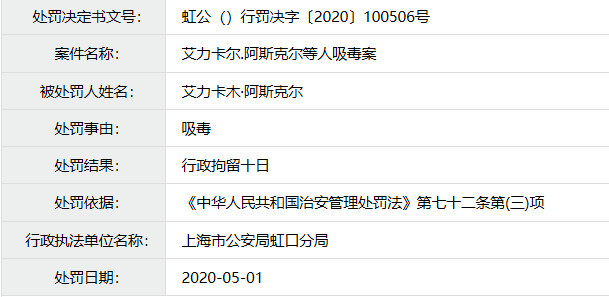 6月3日,腾讯娱乐查找上海市虹口公安分局行政处罚公示名单发现,著名脱口秀演员卡姆曾于2020年5月1日因吸毒被处行政拘留10日。