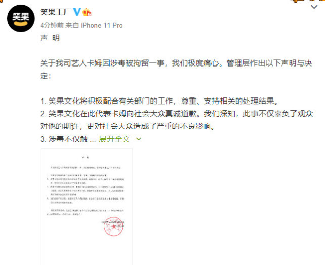 随后,笑果文化发布声明称,将积极配合有关部门的工作,尊重、支持相关的处理结果,无限期停止卡姆的所有工作,并代表卡姆向社会大众真诚道歉。