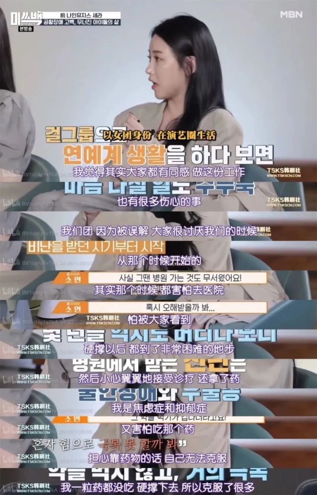这样的情况在女团中也并不是个例,坐在柳世罗旁边的前T-ara成员朴昭妍也同样在遭受着抑郁症的折磨。同为1987年出生的两人,在节目中讲述自己的遭遇后,牵起了彼此的手,仿佛在说我们一起加油战胜病魔吧。“抑郁症”似乎成为了“女团后遗症”一样,即使当红如雪莉、具荷拉她们也没逃过这个病症的魔爪。