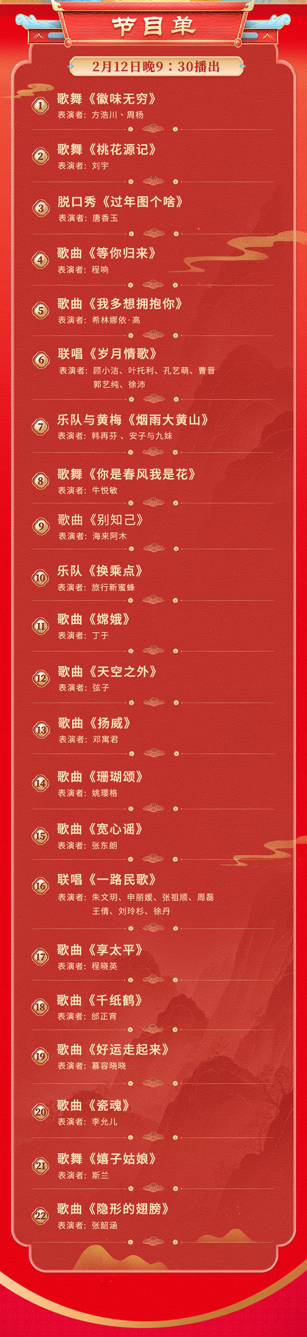 开场节目《徽味无穷》结合安徽传统美食与音乐,展现地域风情;人气偶像刘宇在歌舞《桃花源记》里,以其精湛舞技与深情演唱,勾勒出陶渊明笔下的梦幻桃源;唐香玉带来的脱口秀《过年图个啥》,以幽默诙谐的语言、敏锐的视角,剖析过年期间的种种趣事;实力唱将程响深情演绎《等你归来》;希林娜依·高用《我多想拥抱你》传递真挚情感;还有张韶涵、九妹、海来阿木、弦子等众多嘉宾也带来了精彩的表演。