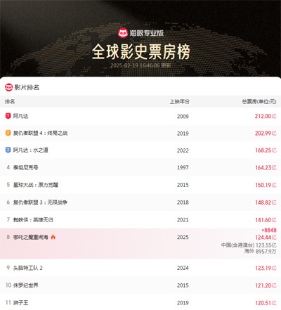 据猫眼专业版数据,电影《哪吒之魔童闹海》上映后票房持续攀升。在2025年2月18日,其票房已超过《头脑特工队2》,达到123.19亿,登顶全球动画电影票房第一名,并位列全球影史票房第8名。