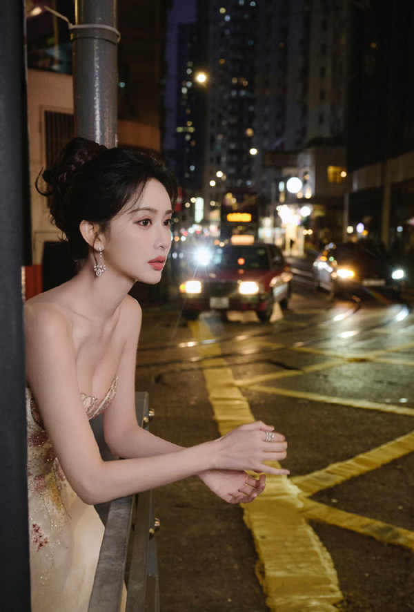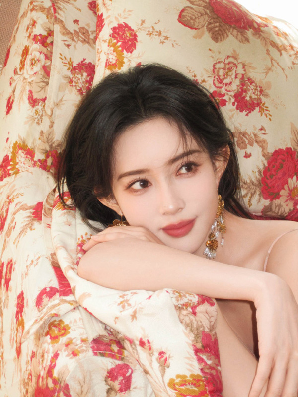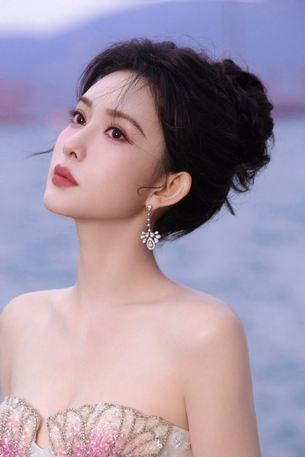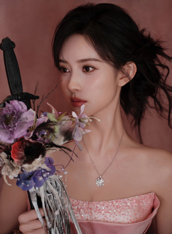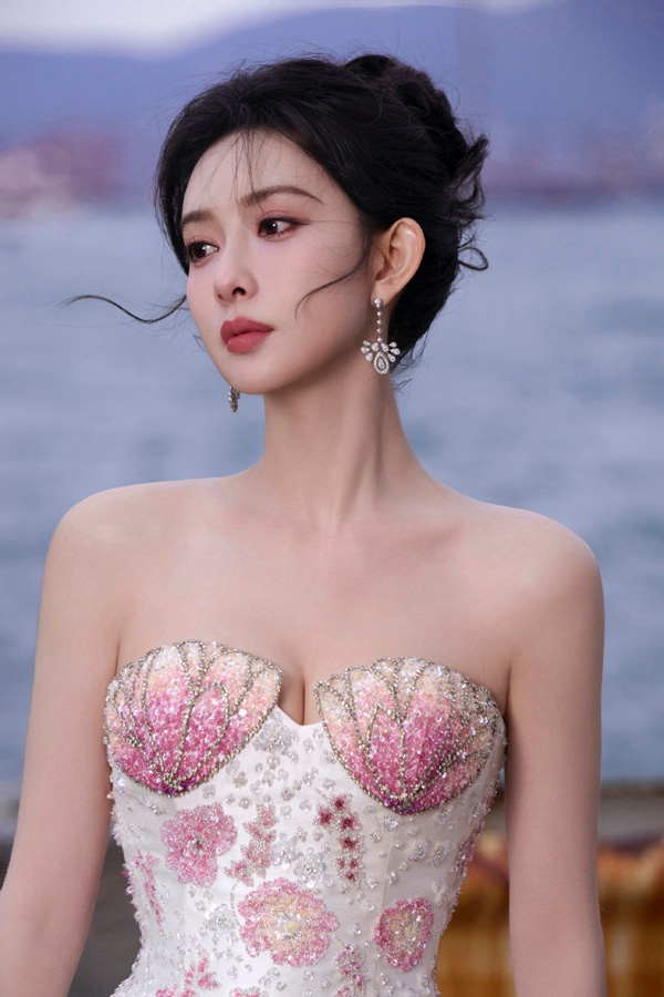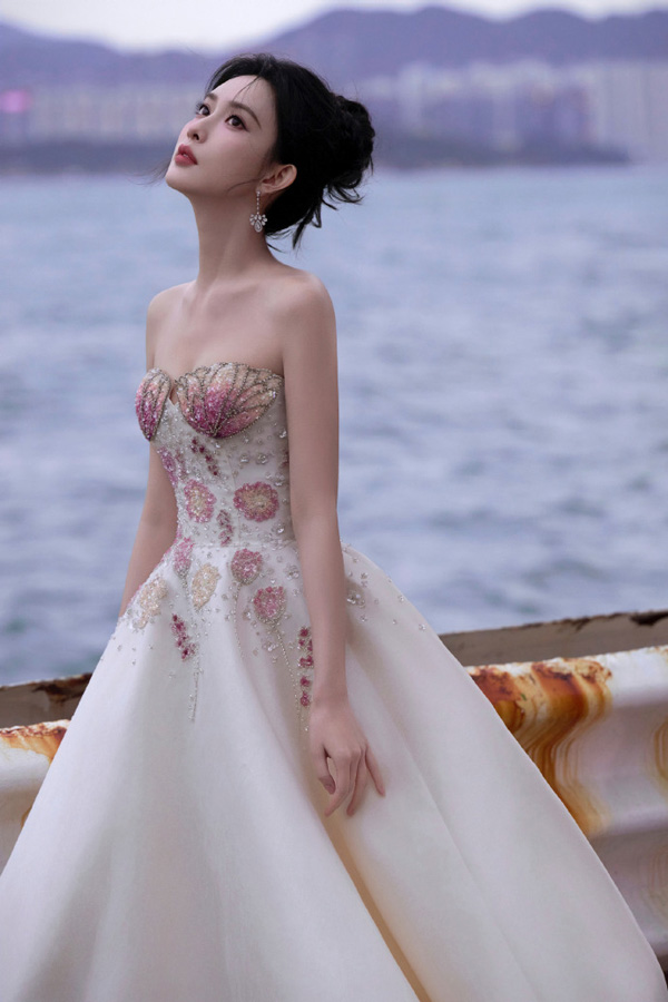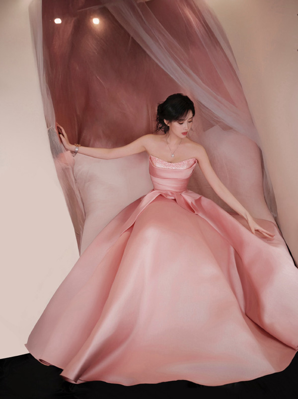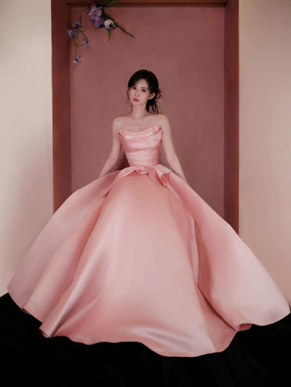 孟子义穿着一件玫瑰粉色的无肩带礼服。礼服的上半部分设计有精致的细节,显得优雅而高贵。裙摆宽大,呈现出丰富的层次感,整体造型显得华丽且充满时尚感。她的发型是黑色,梳得整齐并且有些微卷,使得整个造型更加柔美。背景是一个浅色的展示框,左上角有一些装饰性的花朵,进一步增添了画面的美感。