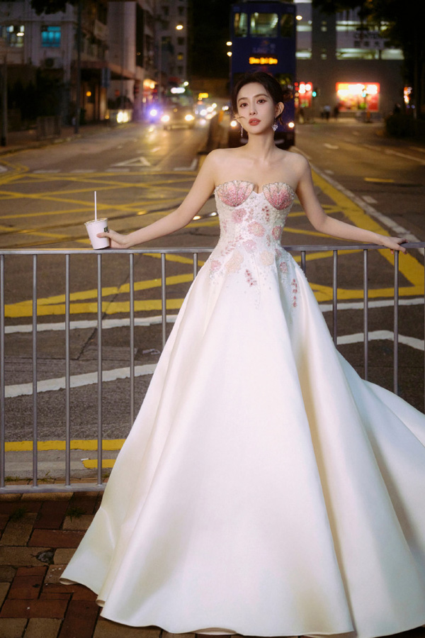 孟子义穿着一件华丽的礼服。这件礼服上半身是粉色调的花纹装饰,显得非常精致。裙摆部分是大面积的白色绸缎材质,呈现出优雅的褶皱,拖尾较长,显得非常高贵和典雅。