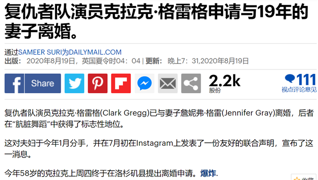 八月十九日,据外媒报道,《神盾局特工》中的“寇森”饰演者克拉克格雷格被曝出上周四在洛杉矶与妻子詹妮弗格雷正式向法院提出了离婚申请。