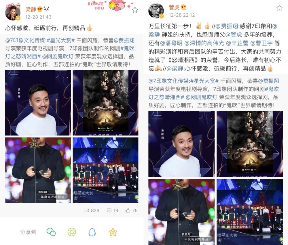 在此前举办的2019腾讯星光大赏上,导演费振翔携《怒晴湘西》双双获奖,荣获年度电视剧导演、年度观众选择剧两大奖项。除此之外,《怒晴湘西》还获得第四届金骨朵网络影视盛典年度十大剧集、第三届金鲛奖2019年度十佳网剧等荣誉。师承管虎导演多年的费振翔一直对作品的品质有着同样的坚持,他在发表领奖感言时表示:感谢所有为“鬼吹灯”系列付出的同仁们,感谢老师管虎,7印象董事长梁静,感谢公司7印象。他还发微博对各方表示感谢,管虎和梁静也纷纷转发微博给予支持和鼓励,尽显团队力量。
