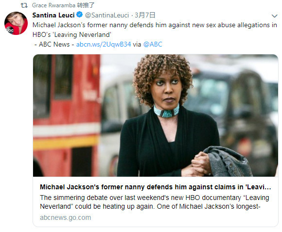 曾为MJ做保姆17年的格蕾丝(Grace Rwaramba)在美媒ABC发表声明,她表示从来没有看到MJ性侵孩子,指责纪录片“造假”。她说:“如果迈克尔伤害了Wade Robson和James Safechuck,我对他俩深表同情。我不知道迈克尔和指控他的人之间发生了什么,我不在场。然而,因为迈克尔现在无法再为自己辩护,而且我对他和他的生活有着独特的视角,我觉得我有必要宣告我对此的想法。Wade和James所描述的迈克尔绝对不是我认识的迈克尔。”