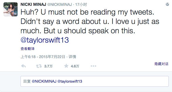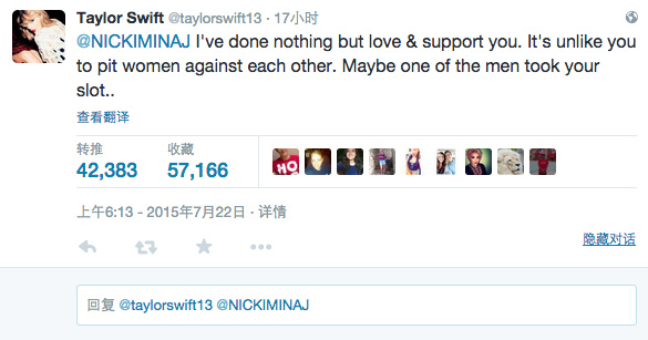 虽然这场骂战最后以双方决定“冷处理”而收场,但在这期间,霉霉敌友纷纷乱入,水果姐也发推特说:“搞笑,有人还好意思说别人挑拨女性之间的争斗?”