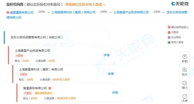 亚东北辰股权穿透指向复星国际 来源:天眼查