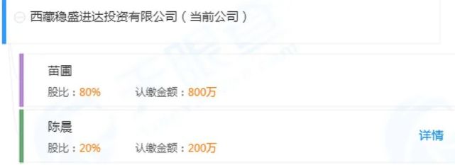 更为有趣的是西藏稳盛进达投资有限公司(下称“西藏稳盛”)。该公司持有张小泉1.71%的股份,其股东包括“苗圃持股80%、陈晨持股20%”。天眼查显示,该公司成立于2016年1月5日,注册资本1000万元,主营项目投资、投资顾问等业务。