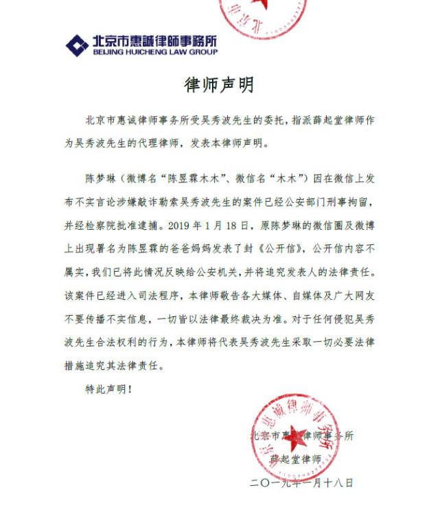 “2019年1月18日,原陈梦琳的微信圈及微博上出现署名为陈昱霖的爸爸妈妈发表了封《公开信》,公开信内容不属实,我们已将此情况反映给公安机关,并将追究发表人的法律责任。该案件已经进入司法程序,本律师敬告各大媒体、自媒体及广大网友不要传播不实信息,一切皆以法律最终裁决为准。对于任何侵犯吴秀波先生合法权利的行为,本律师将代表吴秀波先生采取一切必要法律措施追究其法律责任。”