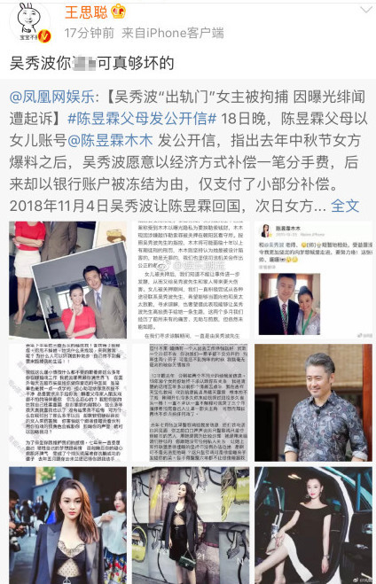 消息发出后,素有“娱乐圈纪检委”之称的王思聪连发两条微博diss吴秀波“渣男本渣”、“真坏”,目前事件还在进一步调查中。